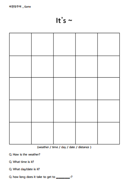 6) 동일하게 B가 It's ~로 대답하고 5 Bingo가 완성되는 학생이 이기는 게임이다.