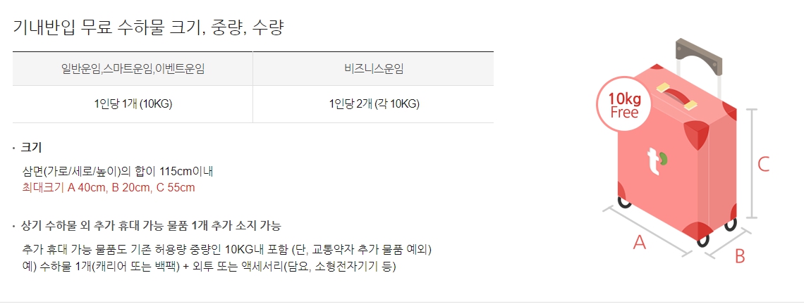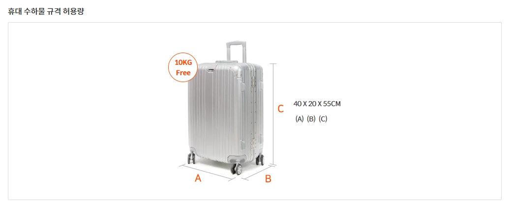 가로 세로 높이 세 변의 합이 115cm 이하여야 합니다 .이때 손잡이와 바퀴도 길이에 포함됩니다.