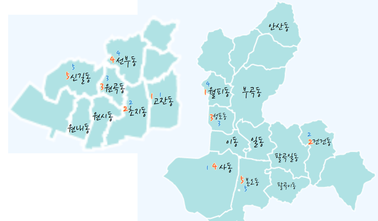 왼쪽 지도는 단원구 오른쪽은 상록구 지도의 행정구역으로 정리했습니다.