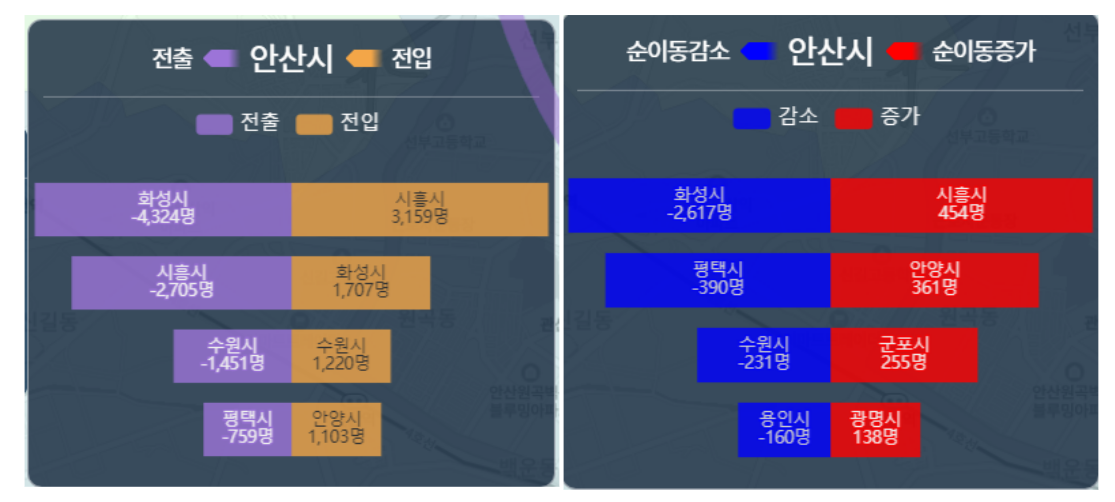 인구 이동은 지리적으로 인접하고 있는 시흥시로 전출이 있고 이외는 직장으로 인한 전출로 보입니다. 순이동 감소 지역도 직장으로 인한이동으로 보입니다.
