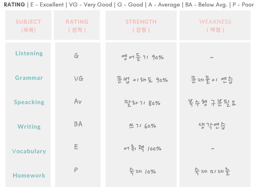 문법 이해도는 90%인데 문제풀이 연습이 더 필요하다와 같이 잘하는점(강점) 과 더 분발해야할 점(약점)으로 표기해서 학부모님들이 한눈에 보기 쉽도록 해서 사용합니다.