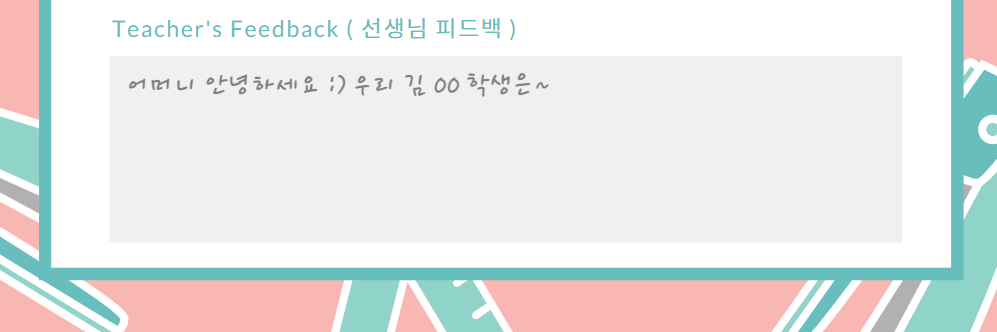 추가적으로 약점 부분은 학원에서 어떻게 보완하겠다와 같은 메시지나 가정에서 이러이러한걸 해주시면 더 도움이 되겟다는 내용이 아래 teacher feedback에 별도로 넣어주시면 더 완벽한 피드백 및 성적표가 되겠죠 ?