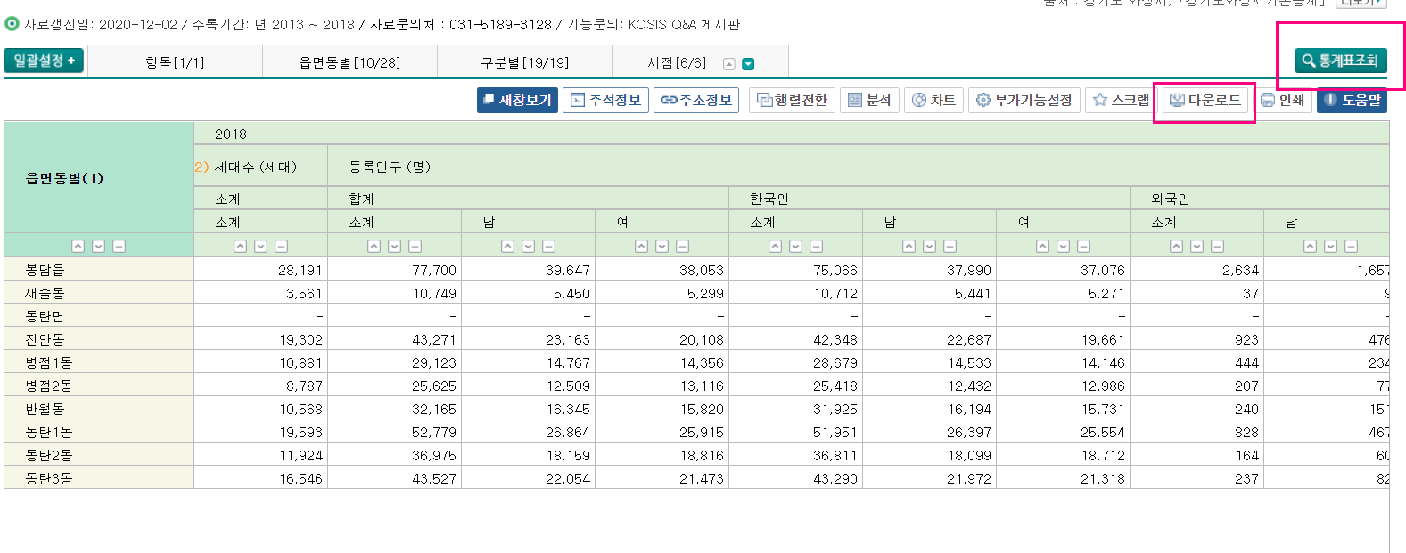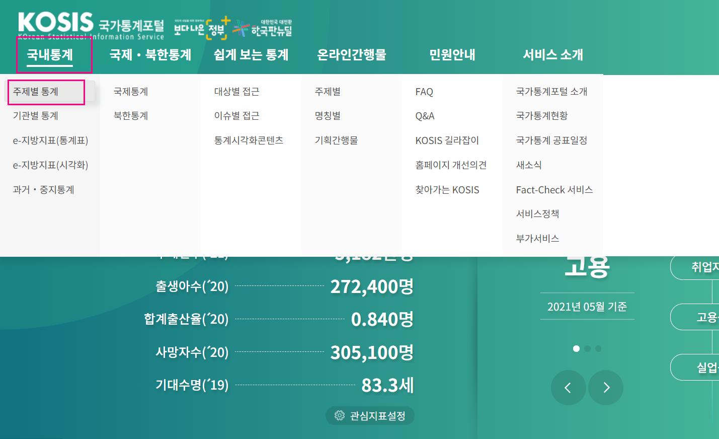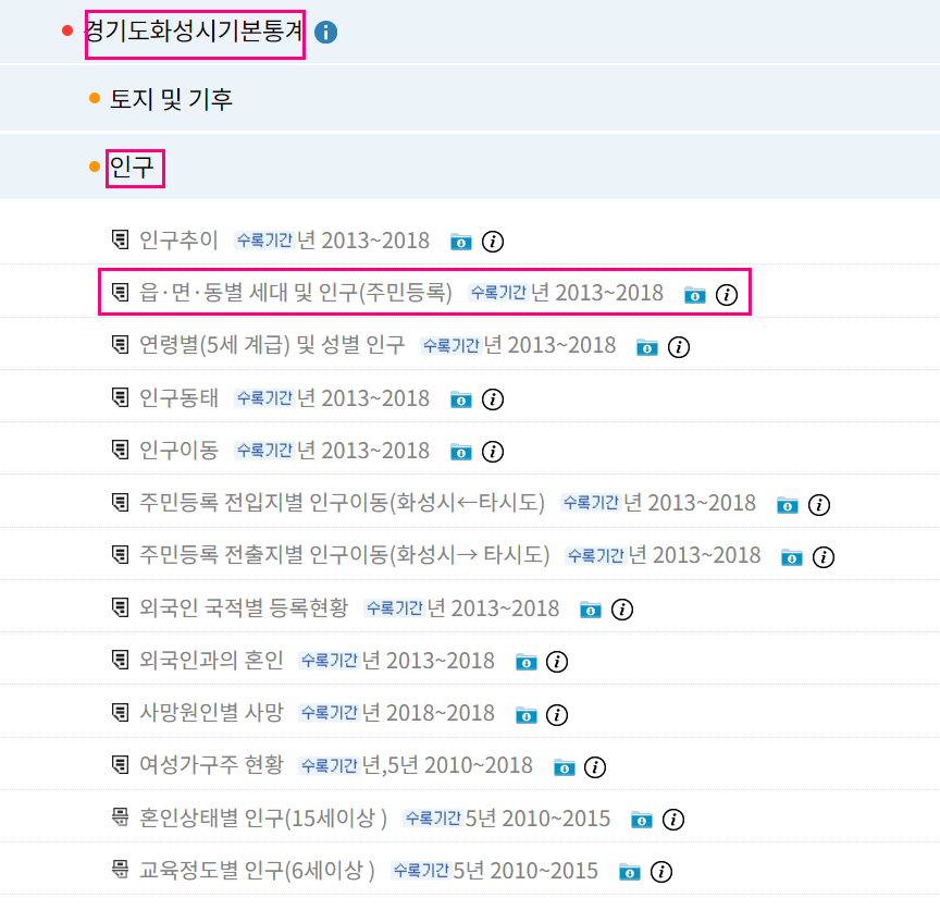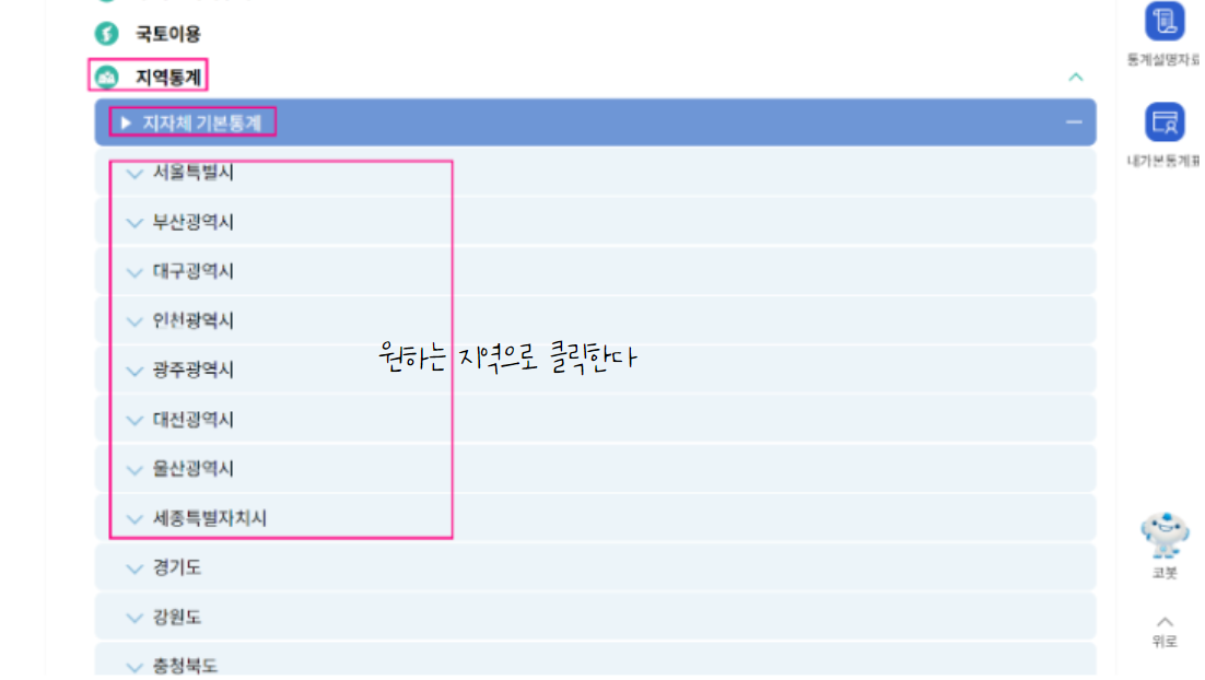 [국내통계 - 주제별통계 - 지역통계 - 지자체 기본통계 - 원하는 지역 클릭 (예. 경기도)]로 들어갑니다.