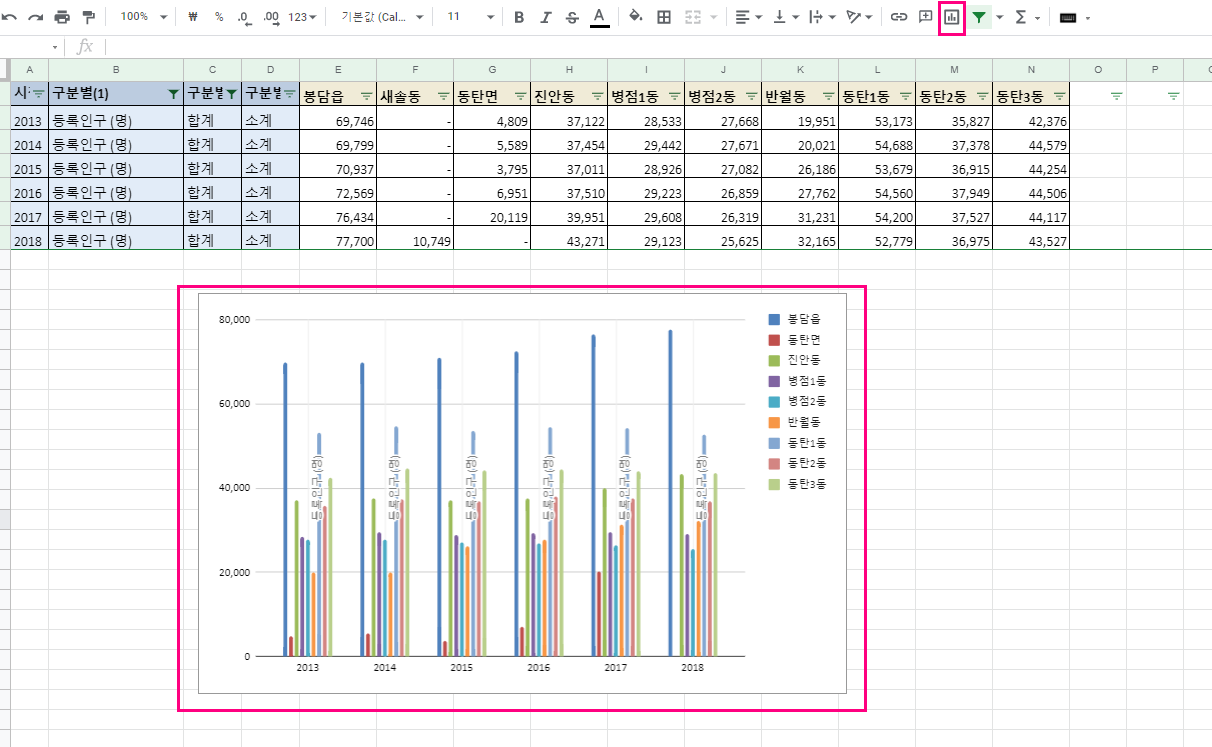 아래 사진과 같이 필터를 넣어 합계 , 인구만 볼수 있도록 합니다.