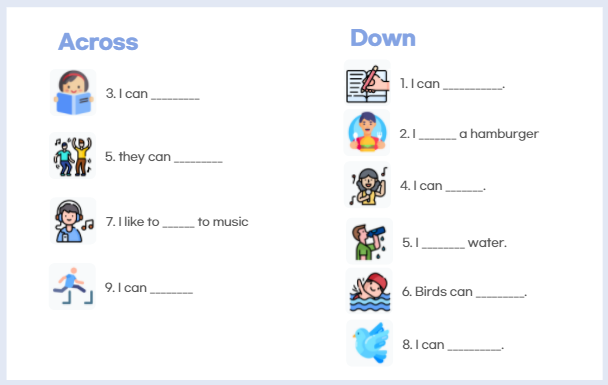 1. write 2. Eat 3. Read 4. Sing 5. Dance 6. drink 7. listen 8. swim 9. jump