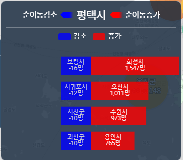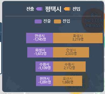 평택시 내에서 전출이 가장많은곳은 안성 화성 수원 천안이고 전입또한 화성 안성 수원 오산에서 많이 들어오고 있습니다. 근처 지역에서 많이 오고 가고 있으며 대부분 삼성 위치에 영향이 있는것같다. 삼성 사업장 위치 위주인것 같다 생각합니다. 순이동 증가지역은 화성 오산 수원 용인시 이며 순이동 감소지역은 크게 신경쓰지 않아도 될 정도로 미미합니다.
