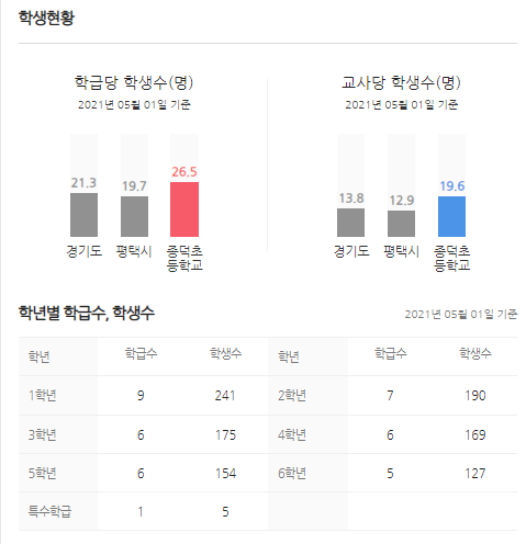 위 사진은 고덕신도시에 있는 종덕초등학교의 학년별 학급수, 학생수 입니다.