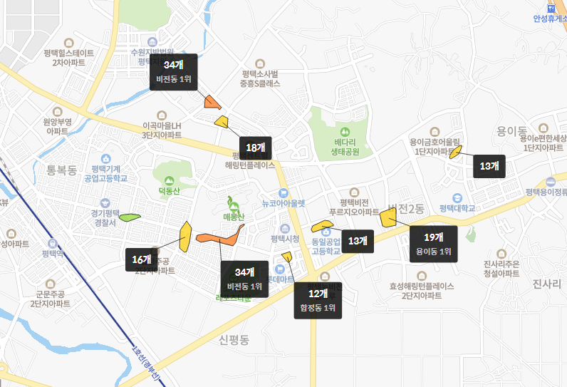 이렇게 호갱노노 학원가로 조사해본 결과 비비전동 용이동에 학원들이 조금 있었습니다.