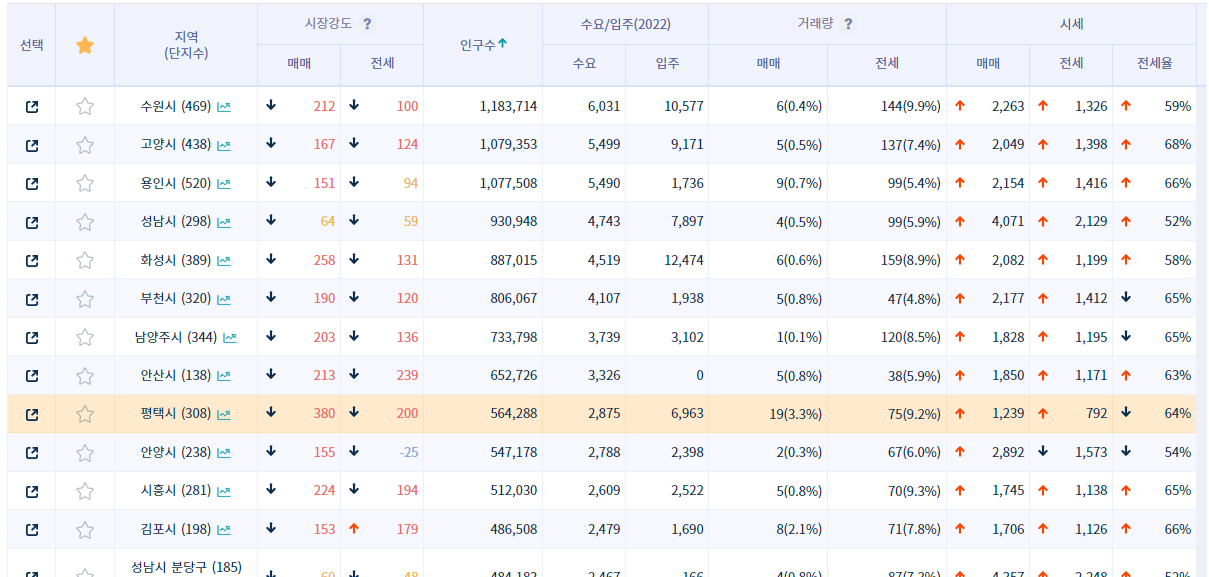 부동산 지인으로 찾아본 시장강도는 전세와 매매가 동시에 떨어지고 있습니다. 거래량또한 전국적으로 다 떨어지고 있으며 평택시도 떨어지고 있습니다. 아직까지 공급 물량이 필요량보다 당분간 더 많이 있을것 같고 ( 현장에도 엄청 많았습니다 ) 미분양은 없는걸로봐서 공급이 조금 해소되면 오르지 않을까 생각해 보았습니다.