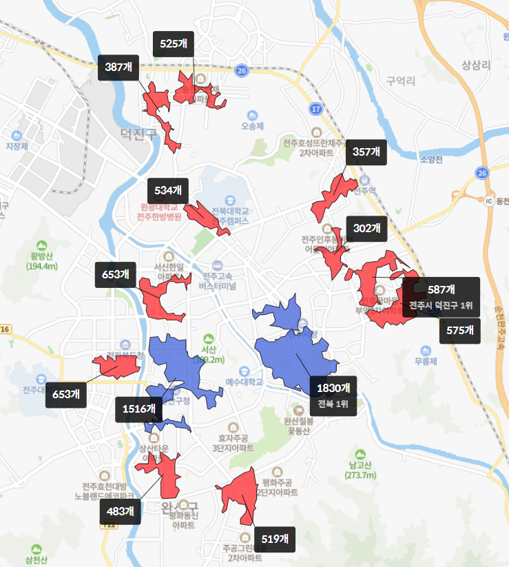 덕진구/완산구로 되어있는데 완산구가 오랫동안 잘사는 지역이었고 잘사는 사람도 많고 한옥마을도 완산구에 있고 주요 상권이 신시가지/ 중화동/효자동을 위주로 대부분 다 완산구에 있엇어요. 백화점도 마트들도 덕진구에 비해서 훨씬많이 있는것 같아요