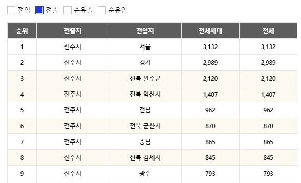 나머지는 대부분 전라북도/남도/광주 안에서