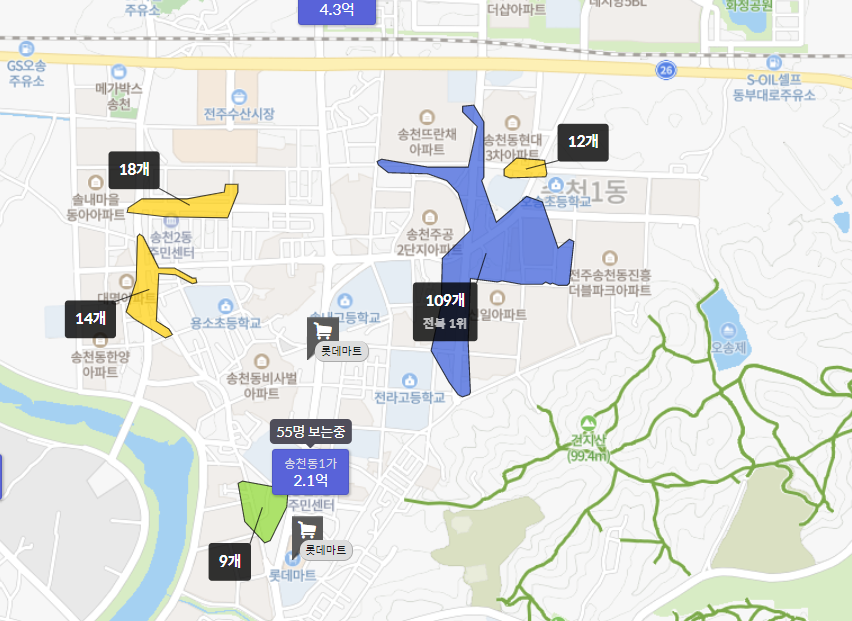 그 다음인 완산구에 대장아파트가 있는 효자동에 효천 노블랜드에코는 진짜 대장아파트의 입지와 환경과 중학교학군과 내부시설도 너무 좋았어요. 단지 구획을 나눠서 애들이 노는 놀이터와 농구코트 배드민턴코드 이런거 있고 그 다음 블럭에는 어른들 위주의 카페시설 공원시설조성 그리고 자전거타고 바로 하천라이딩 주변상권도 학원도 많고 좋더라구요. 맞은편에 우미린도 너무 좋았습니다.