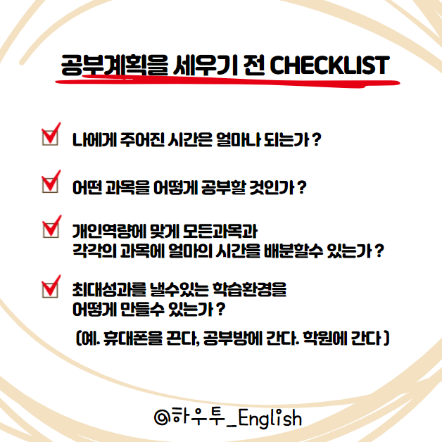: 공부계획은 정확히 내가 무엇을 얼마나 해야할지 시각적으로 보여준다. 최대한 상세하고 자세하게 공부양을 쪼개어 작성한다. 시간과, 공부양을 적절히 배분해서 공부했을때 효과적으로 암기가 가능하고 스트레스를 덜 받는다. 게다가 매일 얼마의 공부를 할지 계획하는것은 시험기간이나 특정 공부를 해야하는 기간에 꾸물대는 시간을 줄일수 있다.