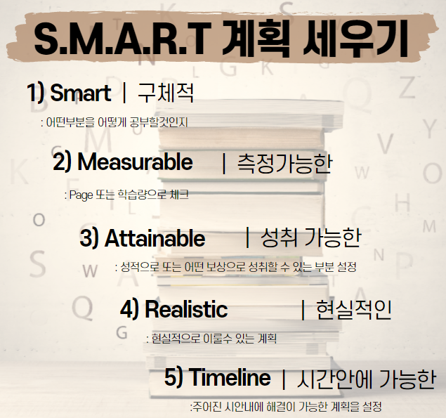 완벽한 공부법 ( 완:공 )이라는 책에 소개된 계획세우는 SMART 방법입니다.