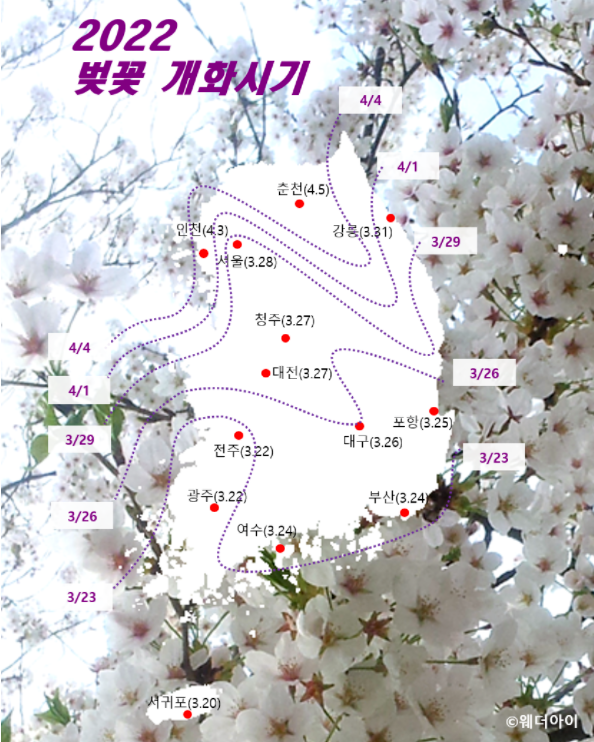 벚꽃 개화시기 예보에서 2022년 벚꽃은 5 ~ 13일 정도 빨리 개화할 것이라고 예보되어 있습니다.
