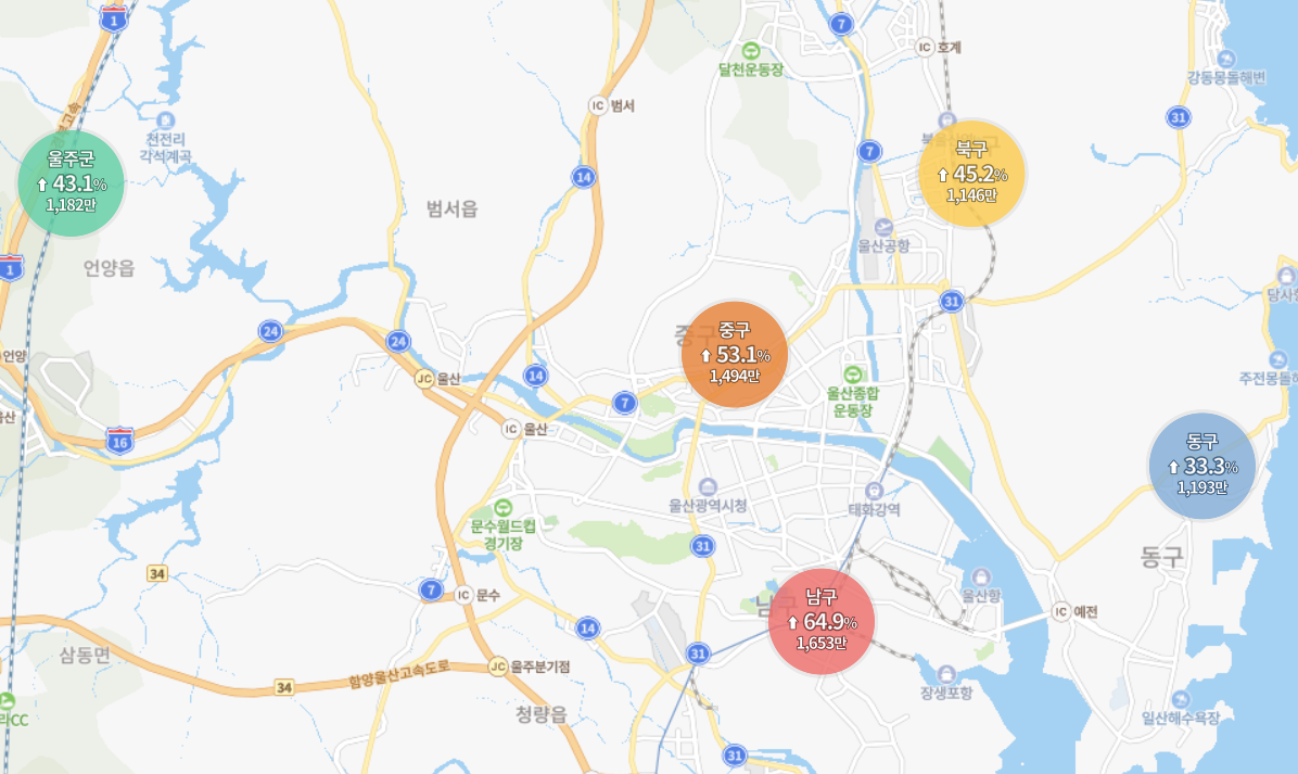 가장많은 상승순으로 보면 남구 - 중구 - 북구 - 울주군 - 동구 순이네요.