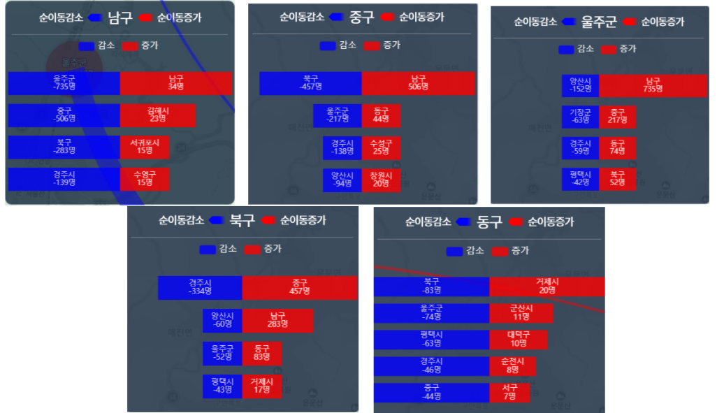 울산 내에서 가장 이동이 많았고 이외 경주와 양산은 인접 지역이라 인구를 많이 뺏기는거 같아 보입니다 이외 수도권 및 타 지역으로의 이동은 수치자체가 많이 않아서 울산은 지역내 이동이 많은 도시라고 보입니다.