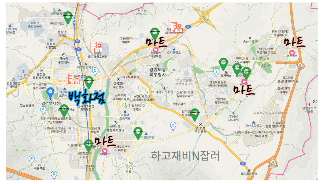 상권은 의정부역 근처 ( 신세계 백화점 외 다수 )에 집중되어 있고 학원가 라고 하기엔 많이 부족하지만 일정 수의 학원들이 주거지에 위치하고 있어요. 실제로 임장시 학원가 라는 느낌을 받긴 어려웠고 학교 근처에 학원들이 몇개 있기는 했지만 다른 경기도 지역들에 비해서 한참 부족해 보였습니다.