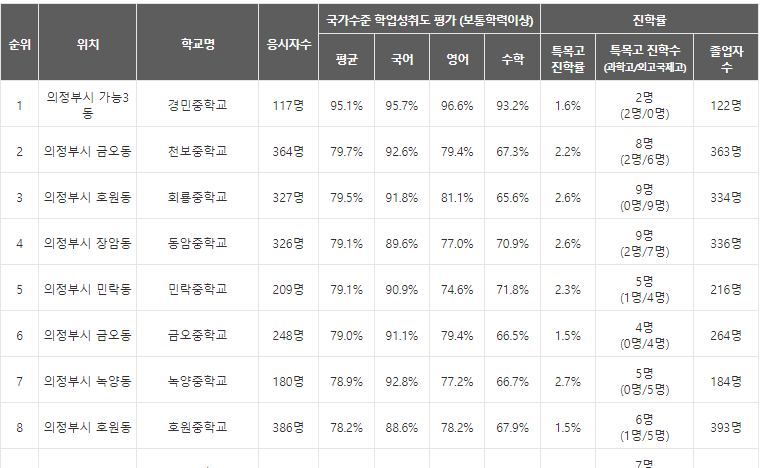 의정부는 한때 학군이 좋기로도 유명했는데 평준화 된이후로 공부는 많이 내려놓은 지역인것 같아 보입니다. 경민재단? 에서 운영하는 경민중학교가 월등히 성취도가 좋고 나머지는 80%되는곳도 보기가 어려운 지역인것 같습니다.