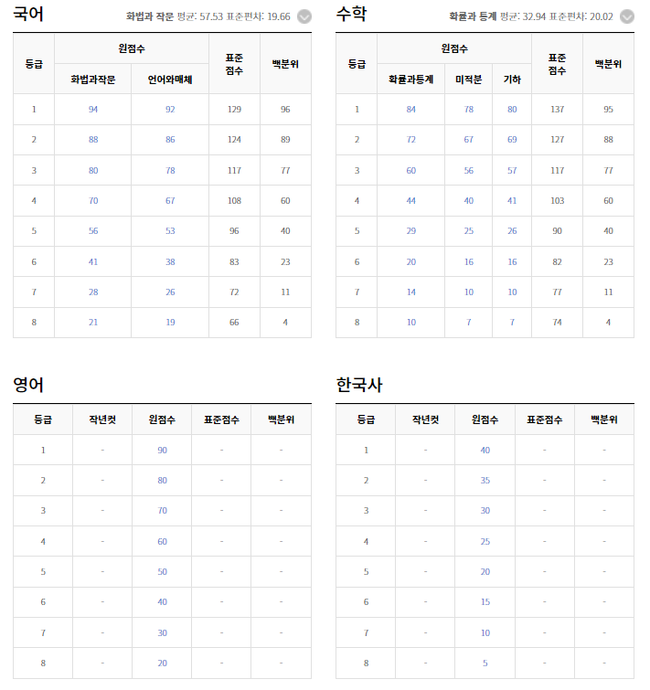 과목별 등급컷 입니다.