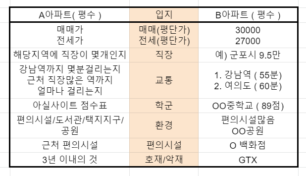 입지분석한 아파트는 최소 2개로 ( 비교대상이 있어야한다) 비교한다.