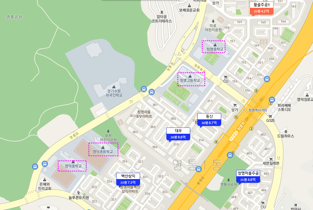 학군 : 황골마을 아파트 - B // 청명중B , 영덕중 A // 영통학원가