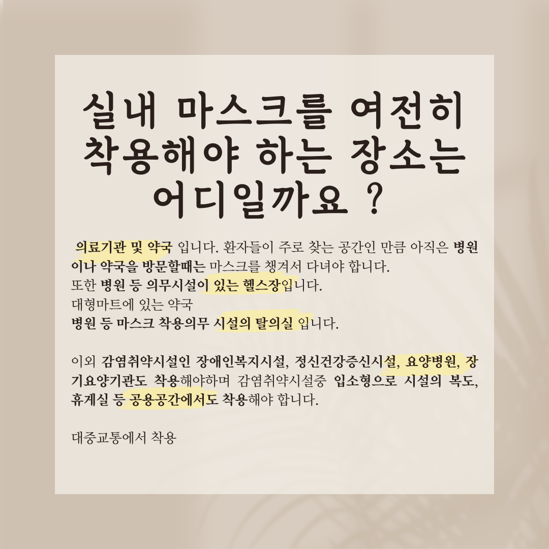 마스크를 필수로 착용해야 하는곳이 있습니다. 대표적으로 의료기관 및 약국입니다. 환자들이 주로 찾는 공간인 만큼 아직은 병원이나 약국을 방문할 때는 마스크를 챙겨서 다녀야 합니다. 또한 병원 등 의무시설이 있는 헬스장입니다. 헬스장 또한 집합공간이므로 여전히 필요합니다.