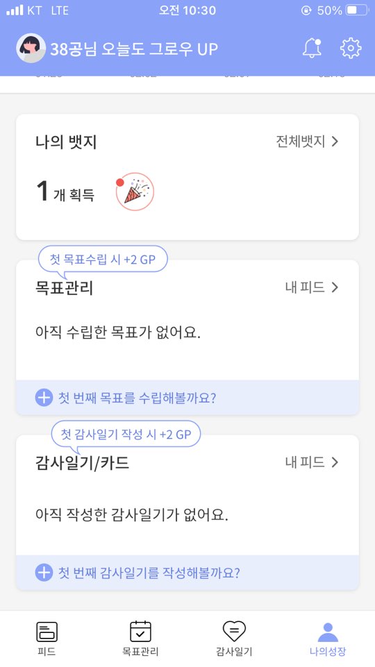 그로우는 뱃지나 포인트로 동기부여 및 피드로 다른 사람들과