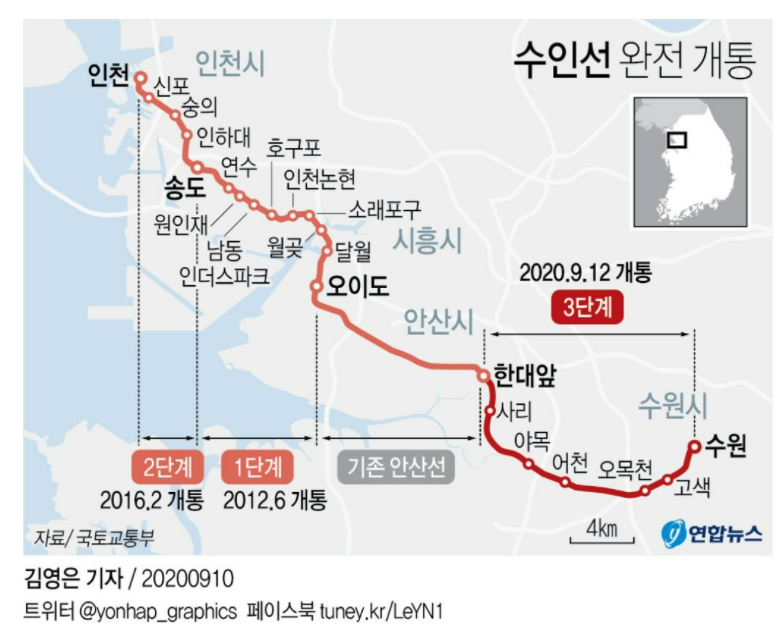 세번째로 수인선은 수원역과 인천역을 연결하는데 수원 - 한대역을 연결해 인천에서 송도를 지나 안산에서 수원으로 이어지는 구간이라고 합니다
