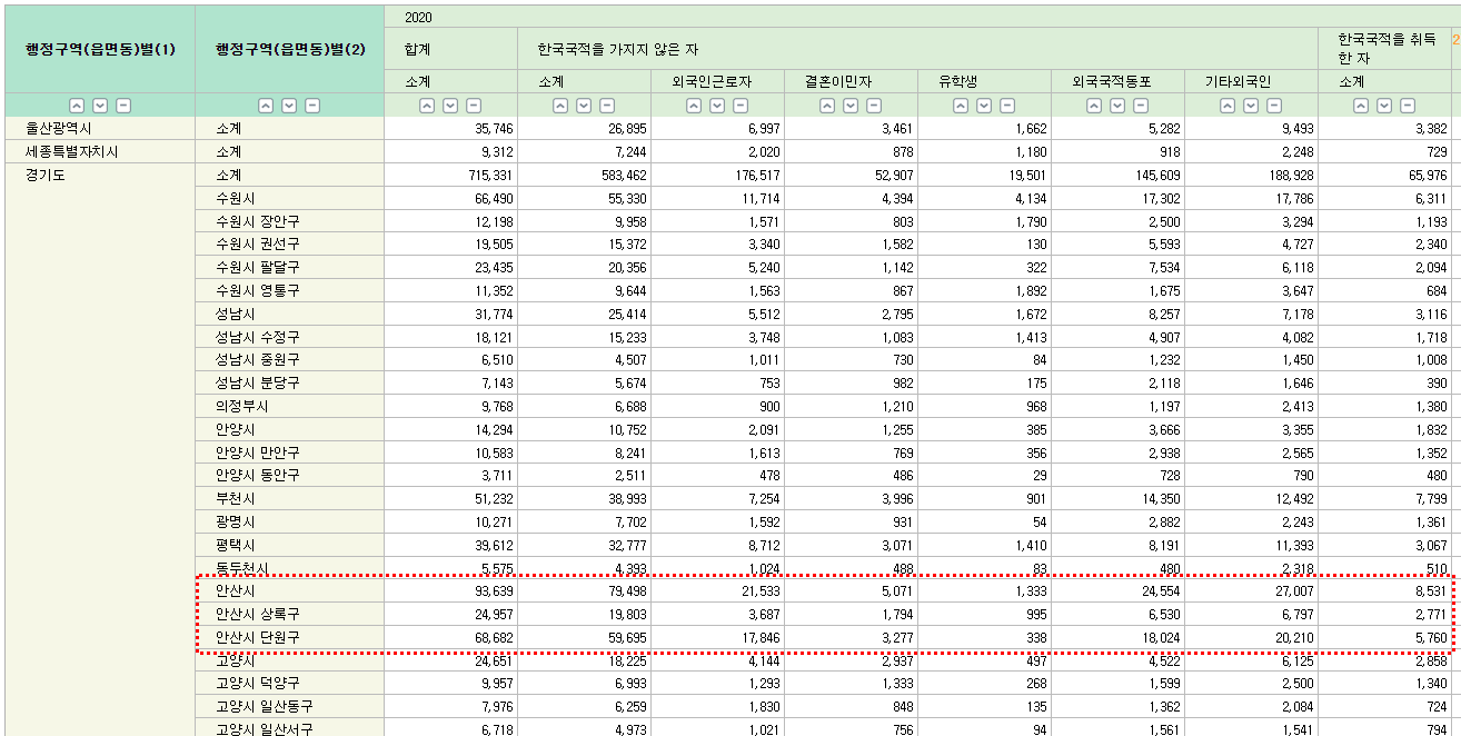 안산시 외국인 비율이 경기도에서 가장 높습니다. 수원시가 55만명인데 안산시가 79만명입니다.