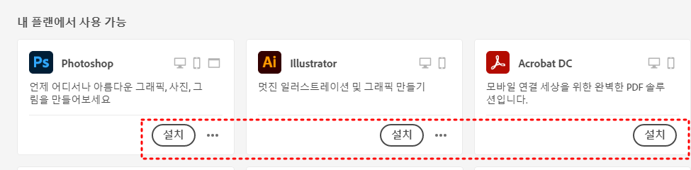 다시 크리에이티브 클라우드에서 설치 버튼을 눌러서 다시 설치해줍니다