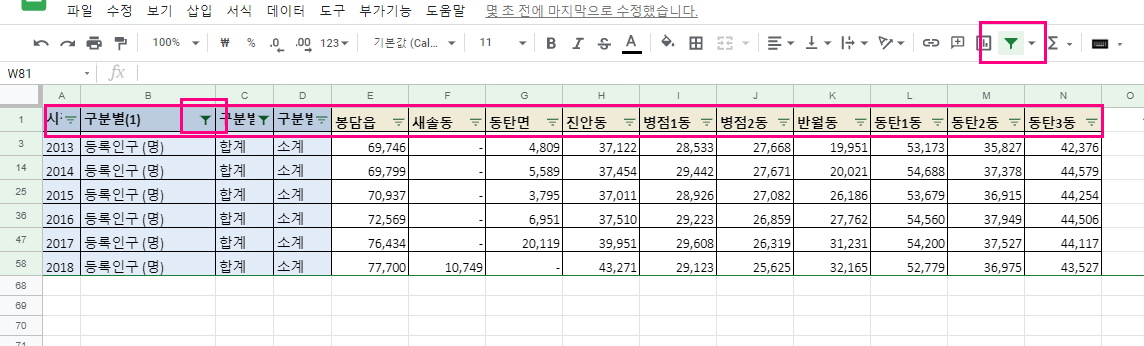 아래 사진과 같이 필터를 넣어 합계 , 인구만 볼수 있도록 합니다.