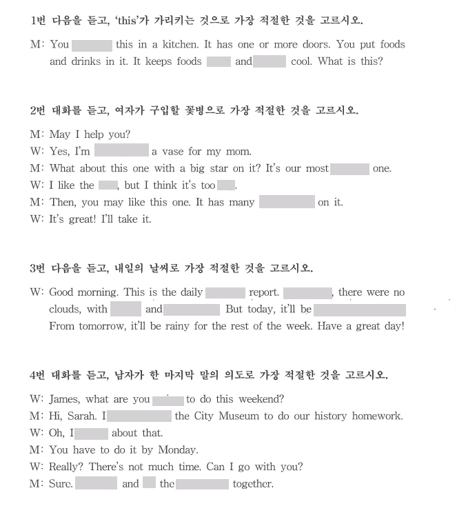 중학교 1학년 학생들을 위한 2021년 하반기에 시도교육청 영어듣기 평가의