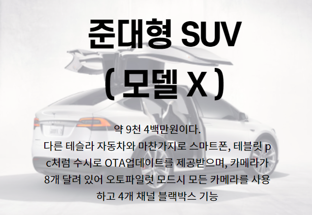 아래 사진들은 태슬라에서 출시한 대표적인 모델들 입니다.