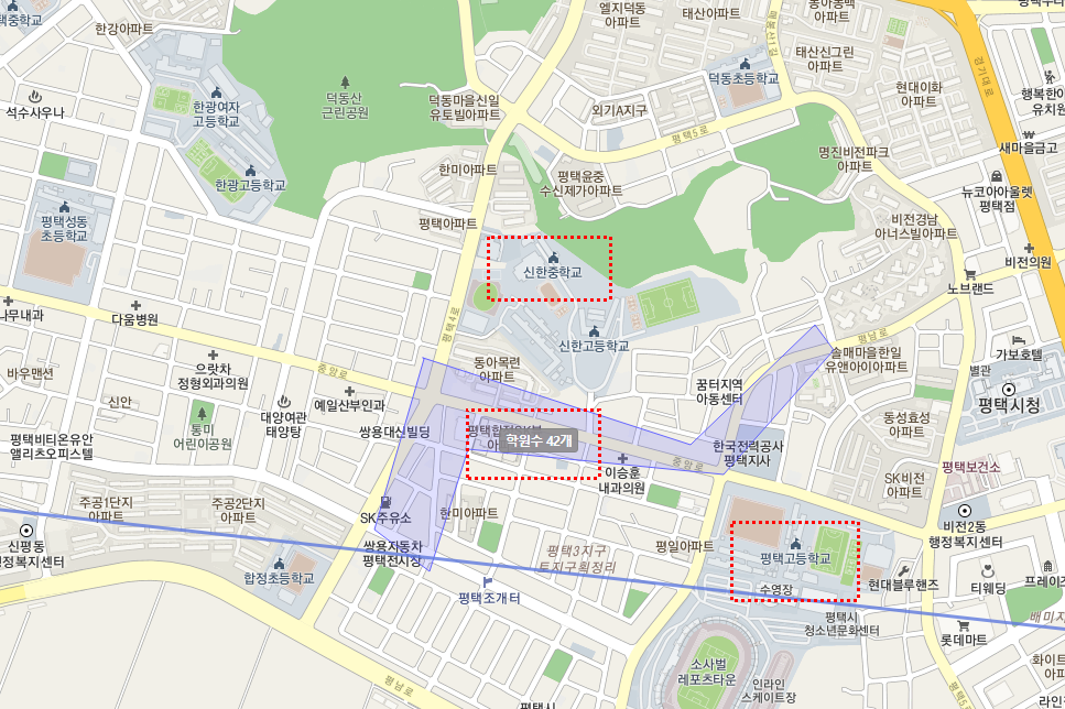 학군으로는 신한중 / 평택고가 있고 학원이 모여있는 여기가 가장 좋아 보입니다.