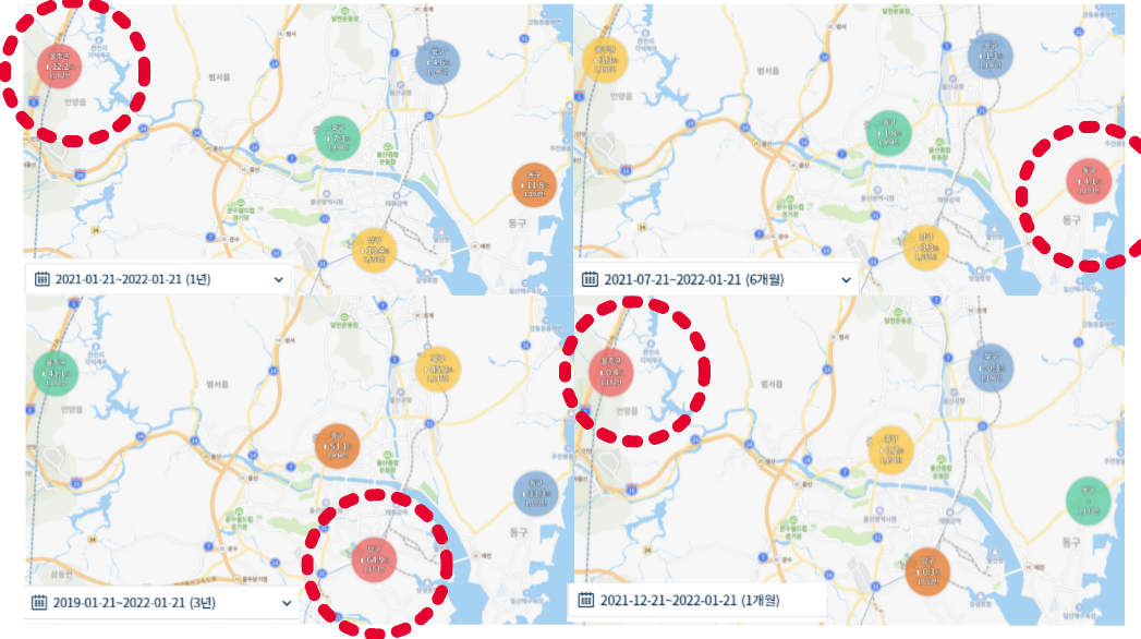 가장많은 상승순으로 보면 남구 - 중구 - 북구 - 울주군 - 동구 순이네요.