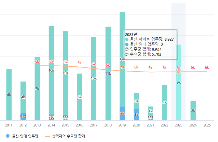 울산의 입주물량을 살펴보면 울산은 물량이 부족했던적이 12년 그리고 16년에 부족했고 이후는 17/18/19년에 물량이 많이서 가격이 전국에서 11위까지 밀려났던게 아닌가 싶습니다. 그리고 20년부터 22년까지는 부족하고 23년에는 다시 입주물량이 계획되어있지만 20-22년까지 물량이 없어서서 23년은 시장에 큰 타격없이 해소될수 있을것 같습니다.