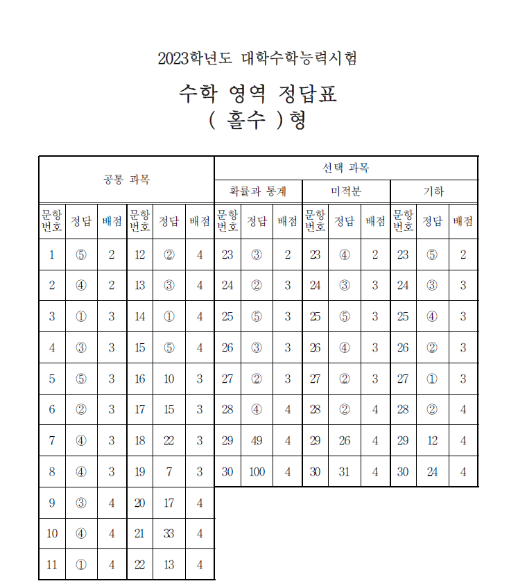 2023년 수능 기출문제 수학 정답 등급 해설