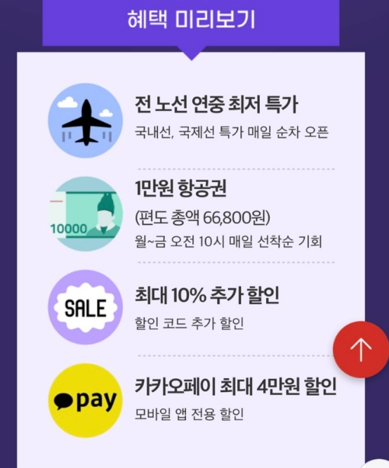이뿐만 아니라 9일에는 할인 코드를 오픈해서 한국에서 출발하는 국제선 왕복 항공권을 구매하는 고객을 대상으로는 운임할인을 6% 제공하고 카카오페이 결제 시 혜택 및 제휴 할인도 함께 받을 수 있습니다.