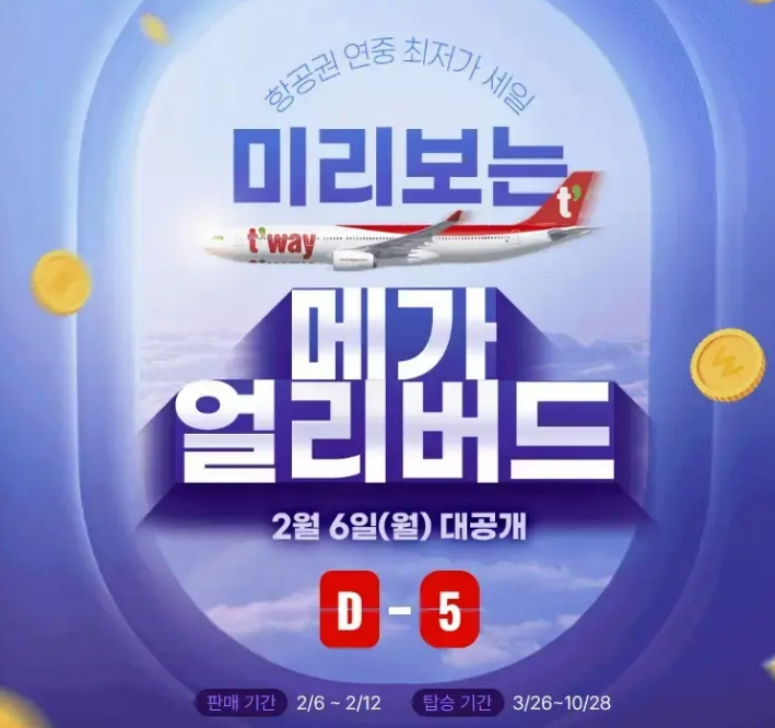 티웨이항공은 19,900원에 제주도행을 메가 얼리버드 프로모션으로 진행합니다. 1년 내도록 최저이며 2월 6일 월요일 오전 10시부터는 국제선 노선인 일본, 동남아, 호주 그리고 중화권(대만, 홍콩) 등 국제선을 그리고 7일에는 오전 10시부터 제주행 국내선 항공권 판매를 시작합니다.